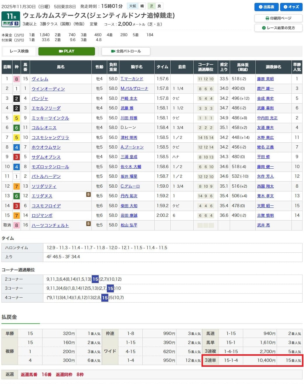 この時点で50万越えとジャパンカップは管理人田中の気が緩み、指定されたジャパンカップ買い目にプラスして遊び買い目を追加して買ってしまいましたが⑧-⑤-①的中!