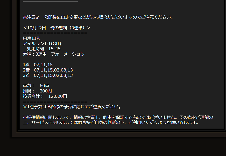 3連単8557.9倍とかもう競馬予想の常識を疑うレベルの的中でした! 17頭立てのブービー人気馬16人気を馬券に入れるとかノリで買う馬券とは違って不可能にちかい、こんな超高額配当が当たる予想があるなら10万20万払っても喉から手が出るほどほしい情報に決まってる。 1万800円の馬券代が1分21秒で256万7370円獲得! 年内競馬しなくても背伸びした生活ができそう。
