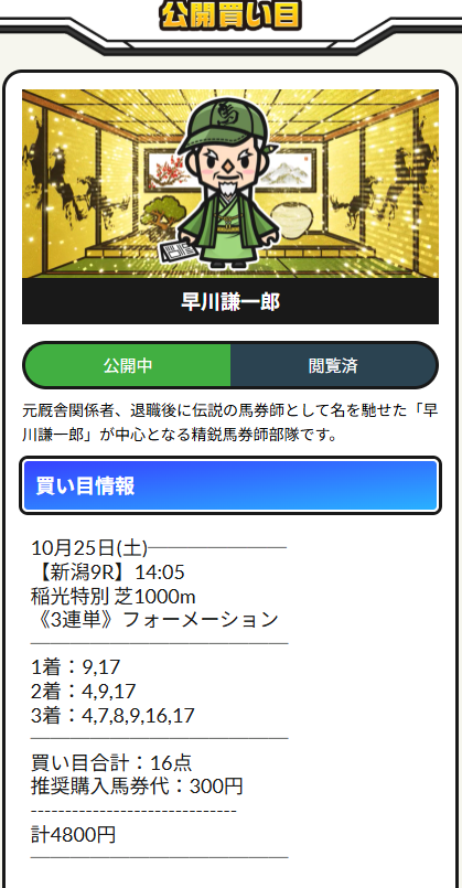キーンランドカップの予想6・16から完璧でしたね! さすがの予想あざました! 夏競馬はリホラボで乗り越えました! ・払戻金額/28,900円 ・回収率/578% 無料情報でこの数値は申し分なしですね!!