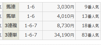 馬連まではさすがに馬券代がはみ出ちゃうから買えなかったけど、3連複&3連単で的中もらえました